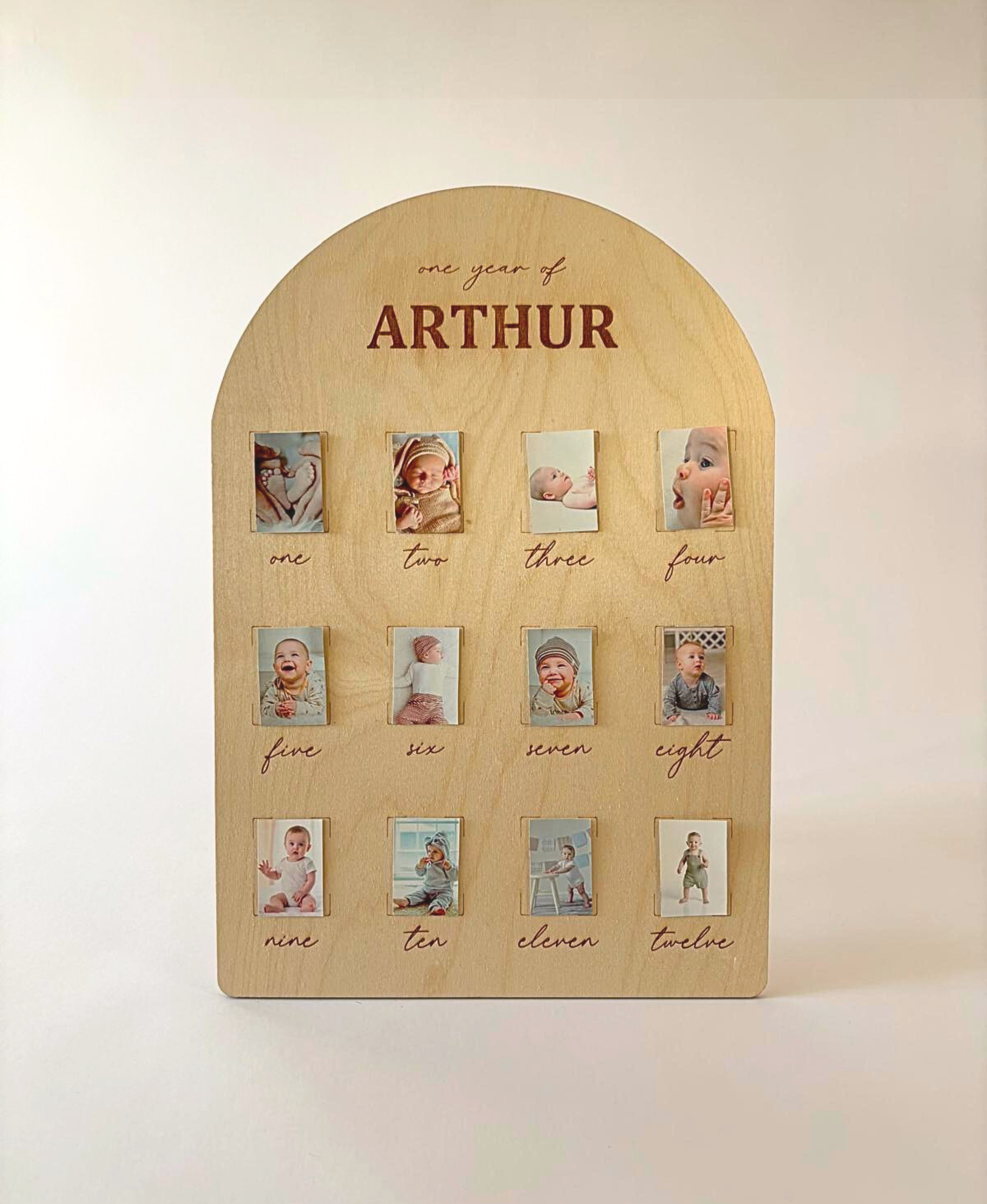 Each board features twelve small photo slots, engraved month by month from one to twelve, creating a beautiful way to see your little one grow.